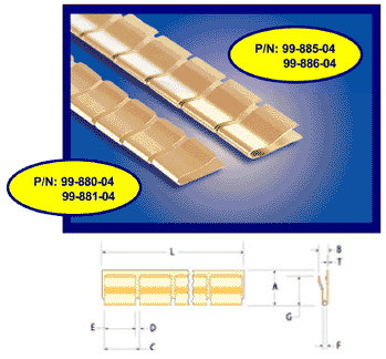 This series of parts was designed for thin flange mount applications that have small gaps requiring RFI/EMI shielding. The low profile provides full electrical contact within a very short range oof f mmovoevmemeen nt. Very low compression forces are required to deflect these items to their optimum performance heights. For even lighter force requirements the 99-885-04 and 99-886-04 are also available in a thinner gage material, designated by a 98 in place of the 99 in the part number. All of these items are available with or without retaining lances in order to provide the desired amount of retention force. Part numbers 99-880-04 and 99-885-04 are without lances for smooth mounting where positioning is fixed and retention not critical. Whereas, part numbers 99-881-04 and 99- 886-04 have lances that grab onto the mounting surface for applications where the part is not confined and retention is more critical. For additional information about this or any other series of parts, please contact our Customer Service department at the numbers shown below.