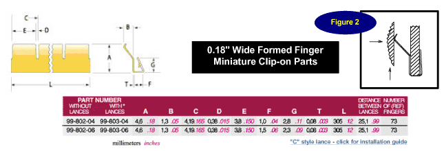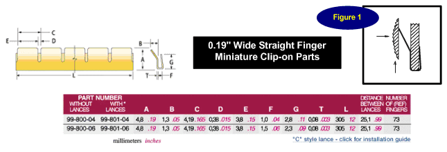 OMEGA SHIELDING PRODUCTS' Miniature Clip-on Series of parts are among the smallest clip-on strips, of this configuration, available today. They require very low compression force and exhibit virtually no compression set. The 99-800 and 99-801 series have straight fingers which, when compressed, provide a "biting" action for surfaces that require abrasion in order to achieve positive contact.