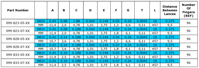 Ideal for most clip-on applications this series of parts combines high-quality performance with cost effective prices. Due to a high-speed method of production, these parts are offered in longer lengths for lower prices. Another added feature is that these parts are segmented after every fourth finger, allowing them to be easily cut into increments of 0.75 inches long. Manufactured in two mounting sizes, they can be mounted to flanges ranging from 0.030 to 0.065 thick.